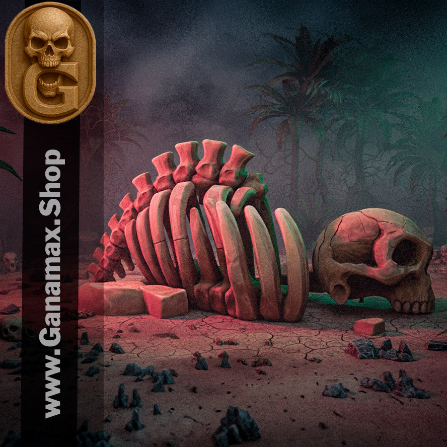 C’est la trace d’une créature ancienne, abattue il y a des siècles, dont les ossements géants émergent de la terre craquelée et des brumes de la jungle. Entre côtes effondrées et crâne fissuré, il évoque une bataille titanesque ou un cataclysme oublié.